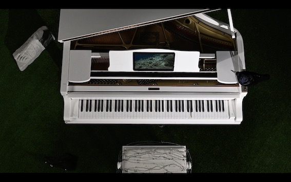 Imbedded in the piano’s music-stand is a computer screen. A video loop includes fragments of music notation and scenes of brilliant underwater life around some of the world’s great coral reefs (by Susan Levenstein).